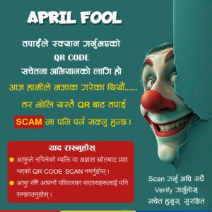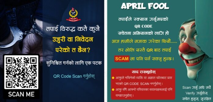 यस पटक भने नेपाल प्रहरीले नै सर्वसाधारणलाई मूर्ख बनाएको (ढाँटेको) छ । आज अप्रिल फुलको अवसरमा सचेतना अभियान चलाउँदै प्रहरीले आफ्नो सामाजिक सञ्जालमा एउटा क्युआर कोड सार्वजनिक गरेको छ ।