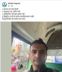 सडक सुरक्षा र हरित ऊर्जाका पक्षपाती रहेका गजुरेलले आज बिहान १० बजे आसपास सामाजिक सञ्जालमा एउटा स्टाटस लेखेका थिए ।