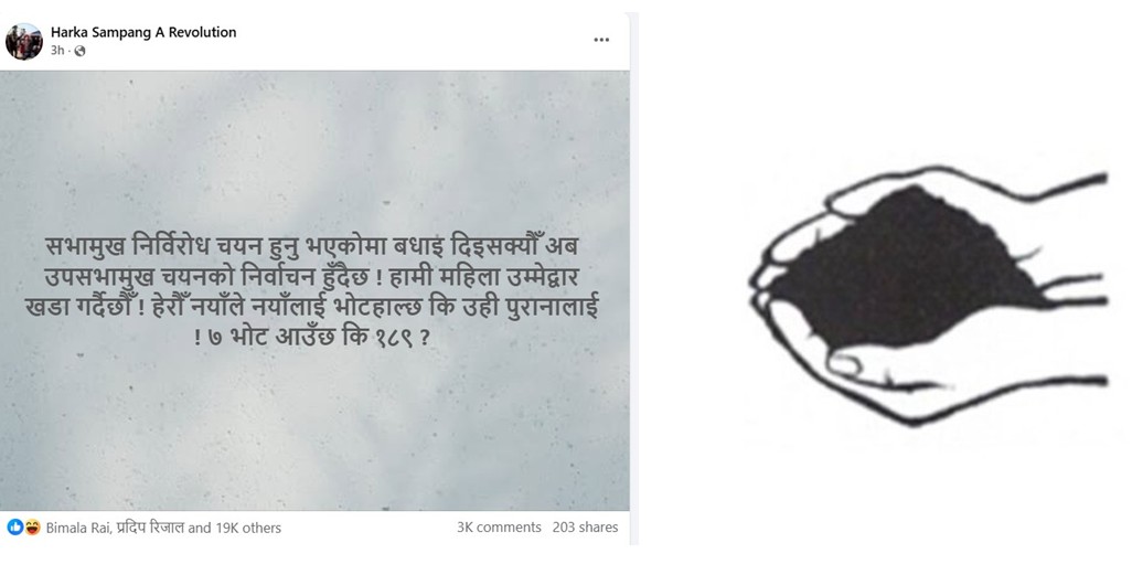 नयाँ पार्टी रास्वपाले अर्काे नयाँ पार्टी श्रम संस्कृतिलाई साथ दिने अपेक्षा व्यक्त गर्दै उनले सामाजिक सञ्जालमा लेखेको छन्, ‘सभामुख निर्विरोध चयन हुनुभएकोमा बधाइ दिइसक्यौँ । अब उपसभामुख चयनको निर्वाचन हुँदै छ । हामी महिला उम्मेदवार खडा गर्दै छौँ । हेरौँ नयाँले नयाँलाई भोट हाल्छ कि उही पुरानालाई । ७ भोट आउँछ कि १८९ ?