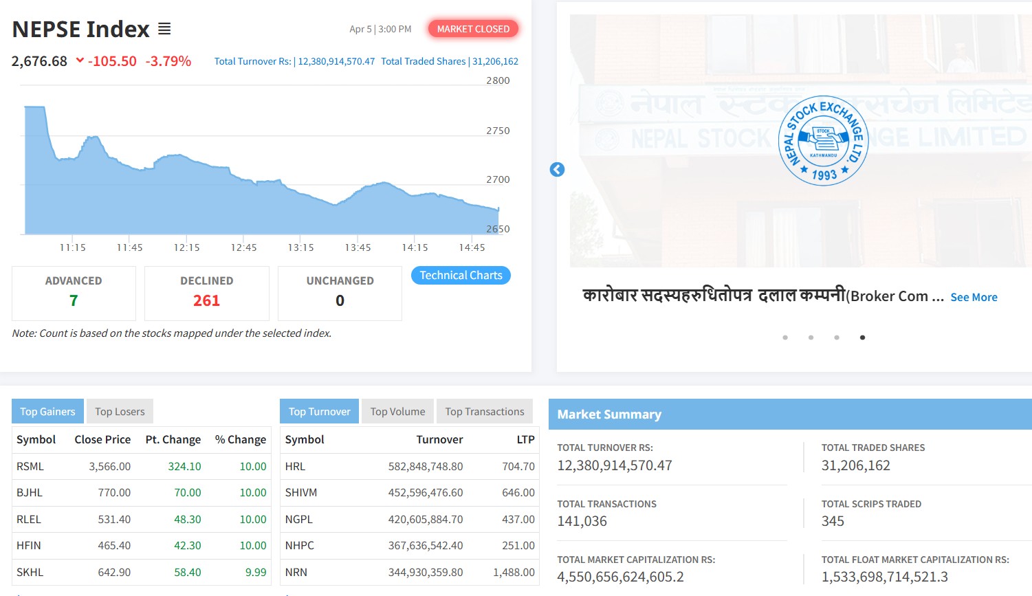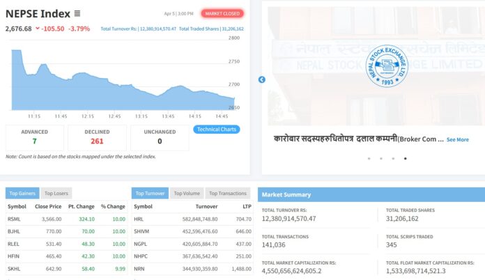 बजार घटेसँगै समग्र बजार पूँजीकरण ४५ खर्ब ५० अर्ब ६५ करोड ६६ लाख २४ हजार ६०५ रुपैयाँ कायम भएको छ ।