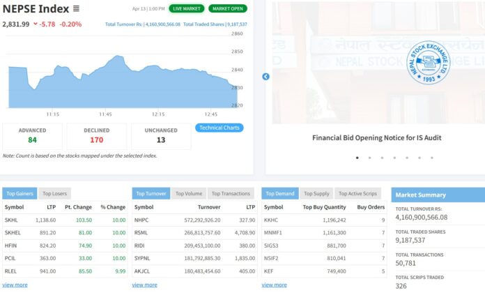 नेप्से सूचक ५.७८ अंकले घटेर २८३२ बिन्दुको आसपासमा शेयर किनबेच भइरहेको छ ।