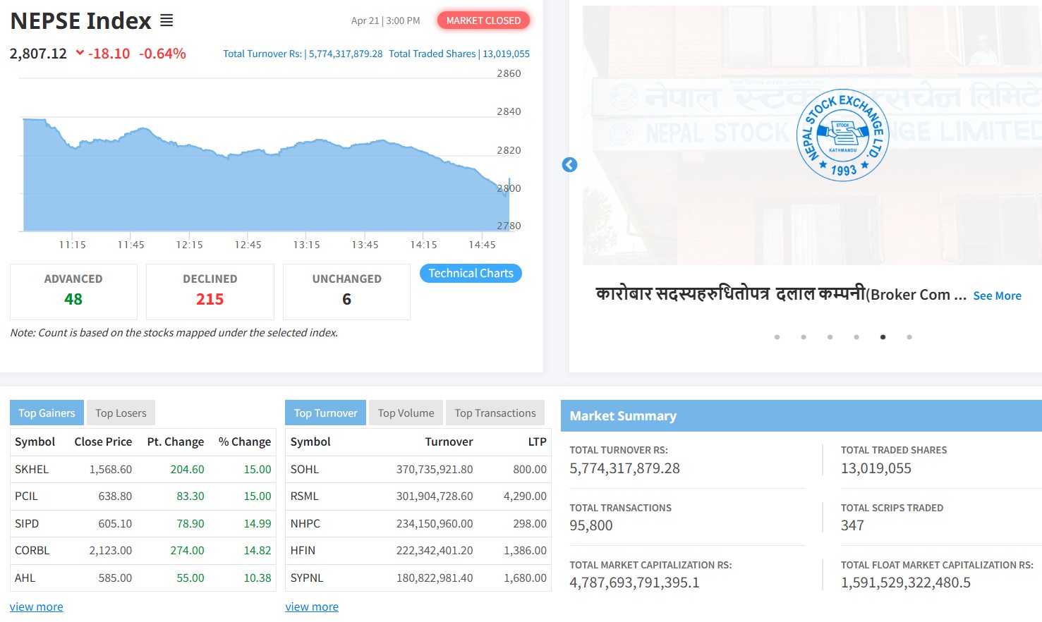 बजार घटेसँगै समग्र बजार पूँजीकरण ४७ खर्ब ८७ अर्ब ६९ करोड ३७ लाख ९१ हजार ३९५ रुपैयाँ कायम भएको छ ।