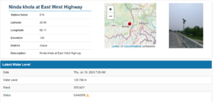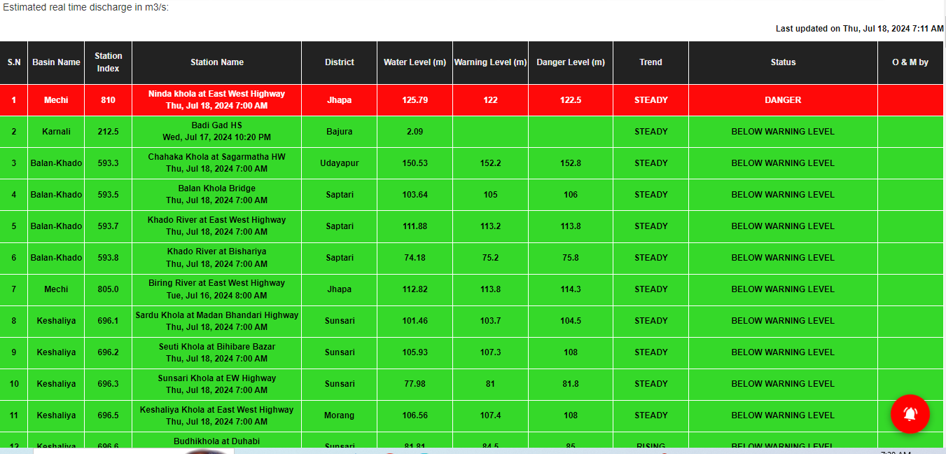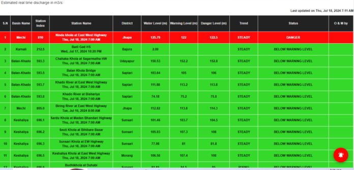 बाढी पूर्वानुमान महाशाखाका अनुसार मेची जलाधार क्षेत्रको निन्दा खोलाको बाढीले खतराको तह पार गरेको छ । खतराको संकेत स्वरुप साइरन बजाइएको छ । भोलि बिहान ७ बजेसम्म सतर्कता अपनाउनुपर्ने महाशाखाले जनाएको छ ।