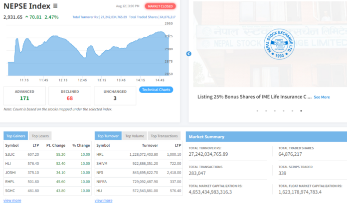 शेयर बजारमा आज ३३९ कम्पनीको २ लाख ८३ हजार ४७ पटकको कारोबारमा ६ करोड ४८ लाख ७६ हजार २१७ कित्ता शेयर कारोबार भएको छ । आज २७ अर्ब २४ करोड २० लाख ३४ हजार ७६५ रुपैयाँको शेयर कारोबार हुँदा बजार पूँजीकरण ४६ खर्ब ५३ अर्ब ४३ करोड ४९ लाख ८३ हजार ३१६ रुपैयाँ कायम भएको छ । नेप्से ७० दशमलव ८१ अर्थात् २ दशमलव ४७ प्रतिशतले बढेर २९३१ दशमलव ६५ मा अडिएको छ ।