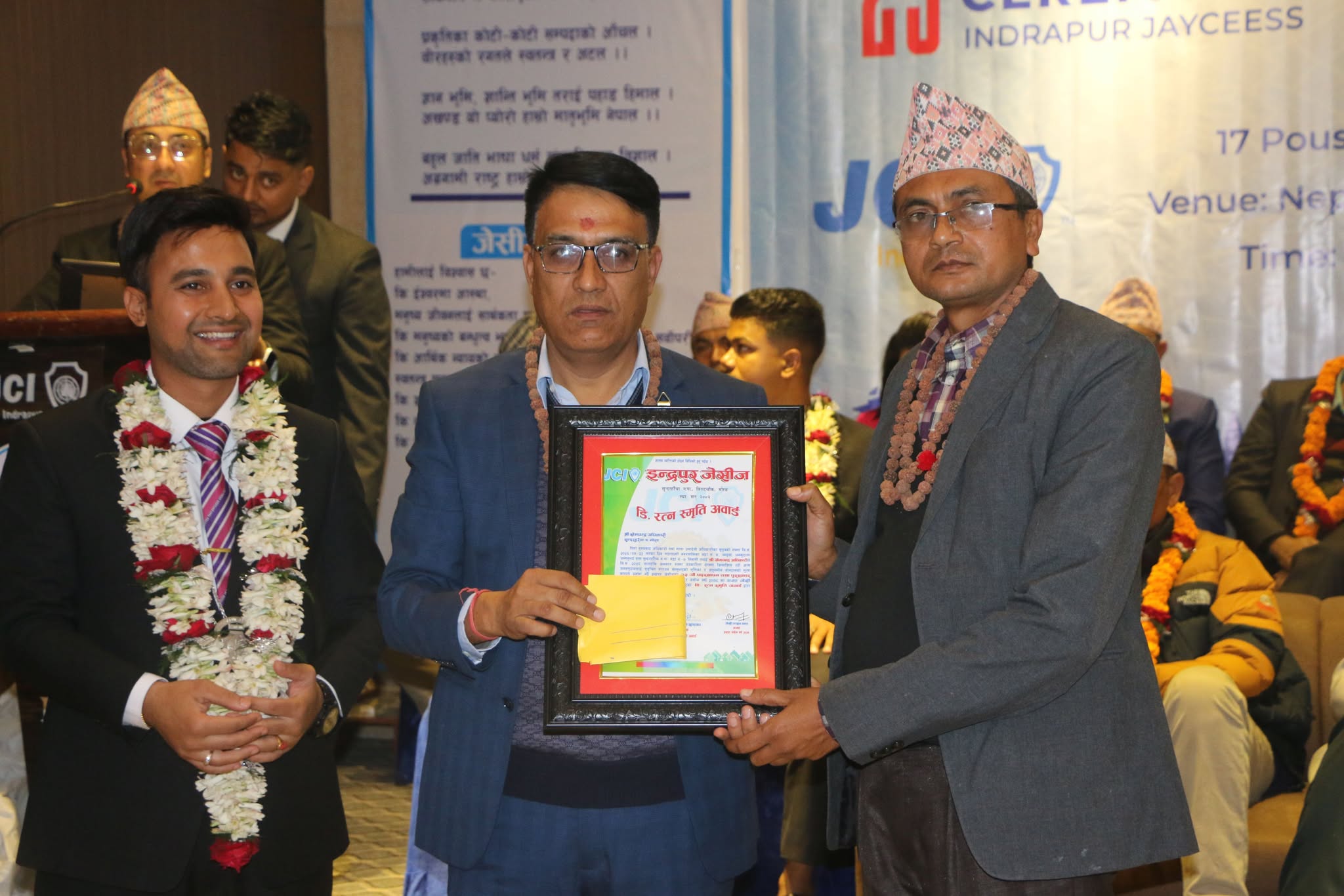 विराटचोकः इन्द्रपुर जेसीजको पदस्थापन बुधबार विराटचोकस्थित नेपालिरिका होटलमा सम्पन्न भएको छ । सो पदस्थापन समारोहमा जेसीजका पूर्व अध्यक्षलगायतले स्थापना गरेका ६ वटा अवार्ड प्रदान गरिएको छ । अवार्डका साथमा प्रमाणपत्र र नगद प्रदान गरिएको थियो ।