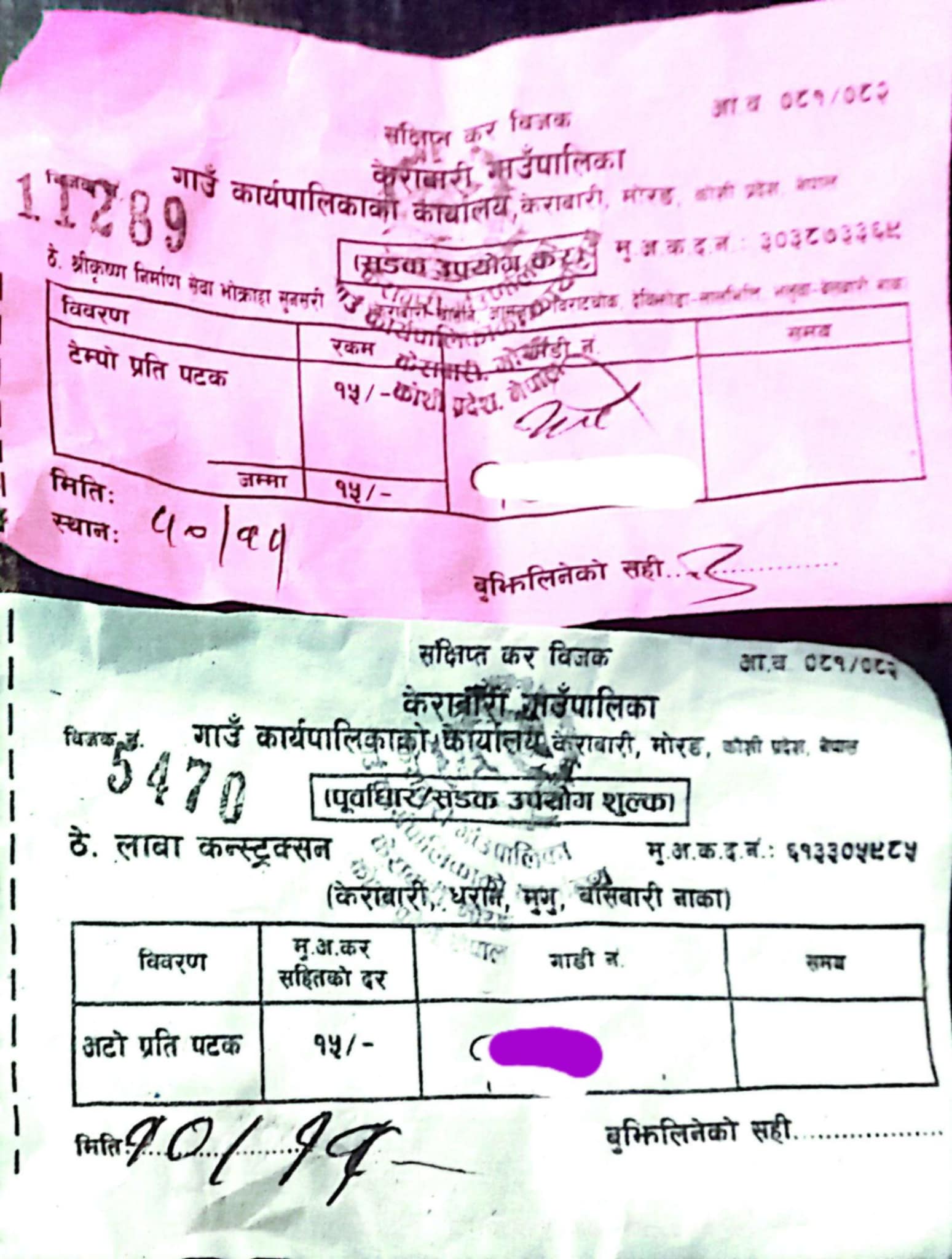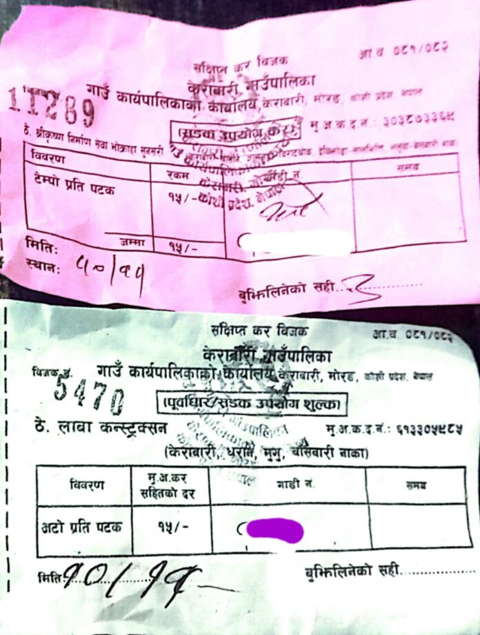ती चालकले तिरेको पटके करको रातो रङको रसीदमा ठेकेदार श्रीकृष्ण निर्माण सेवा भोक्राहा सुनसरी रहेको छ । केराबारी– खोर्साने, आमजुँगी–विराटचोक, देवीझोडा–लालभित्ती र भलुवा–बेलबारी सडक खण्डमा ती ठेकेदारले कर लिँदै आएका छन् ।