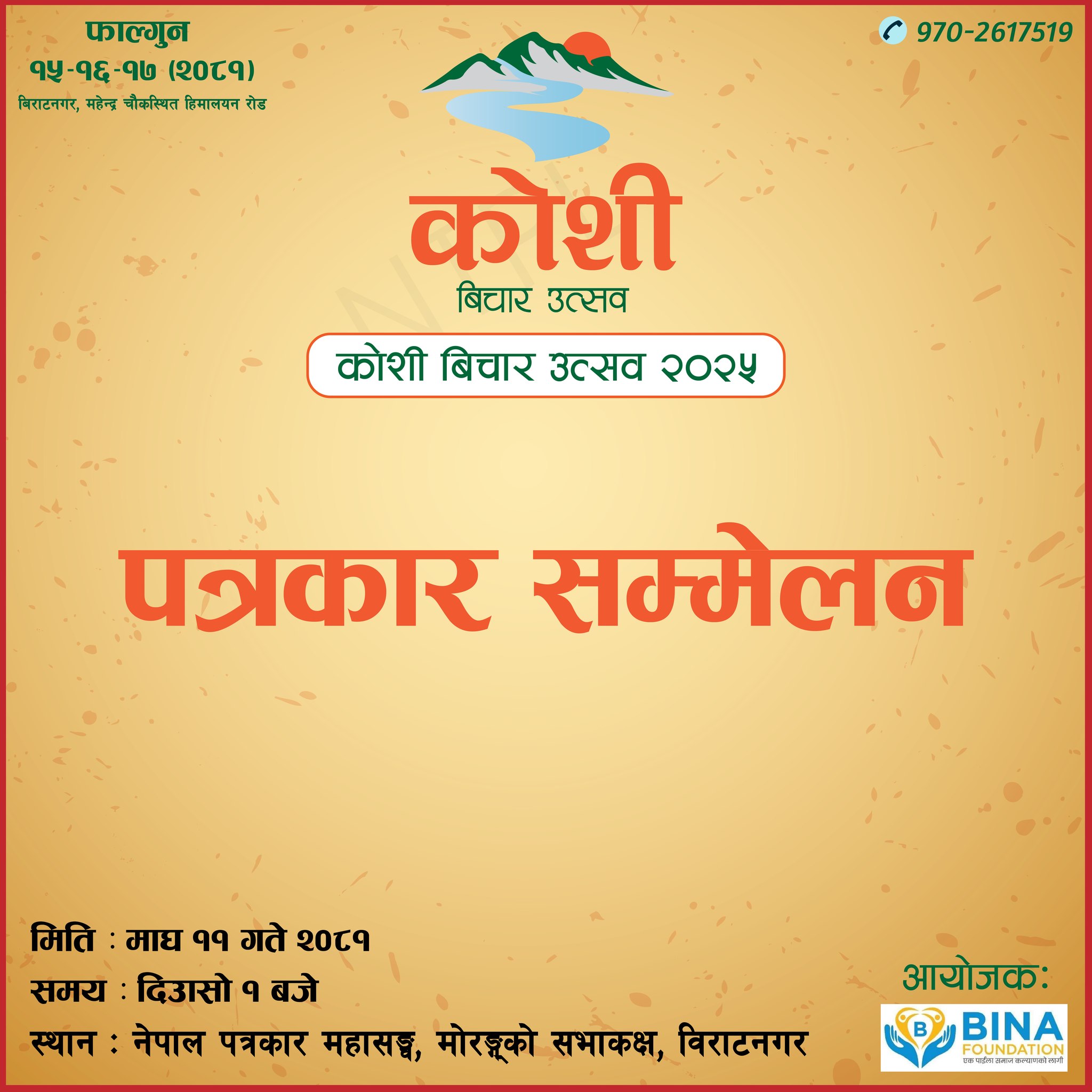 विराटचोकः वीणा फाउण्डेसनको आयोजनामा कोशी प्रदेशमा पहिलो पटक कोशी विचार उत्सव हुने भएको छ । सोही प्रकारको खुला संवाद कार्यक्रम पोखरा, बुटवल, जनकपुर र राजविराजमा भइसकेको आयोजकले विराटनगरमा पत्रकार सम्मेलन गरेर जानकारी दिएको छ ।