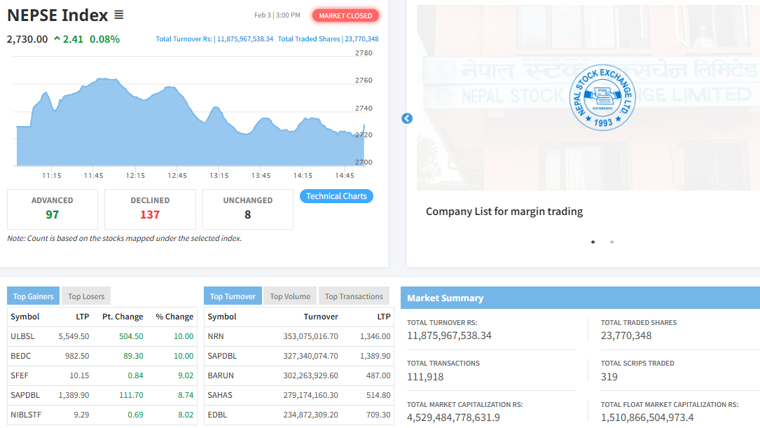विराटचोकः सोमबार नेपाल स्टक एक्सचेञ्च (नेप्से) झिनो अङ्क अर्थात् ० दशमलव ०८ प्रतिशतले बढेर २ हजार ७३० बिन्दुमा पुगेको छ । बजार बढे पनि हिजोको भन्दा कारोबार रकम भने घटेको छ ।
