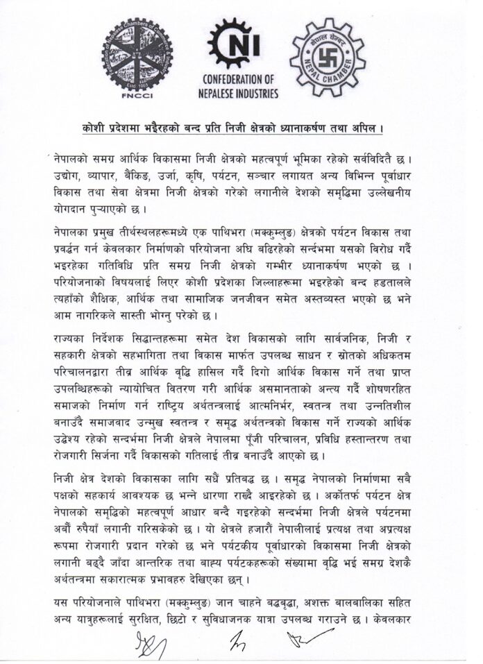 अहिले भइरहेको बन्द हडतालका कार्यक्रम तत्काल रोक्न आग्रह गर्दै नेपाल उद्योग वाणिज्य महासंघ, नेपाल उद्योग परिसंघ र नेपाल चेम्बर अफ कमर्सले संयुक्त विज्ञप्ति जारी गरेका छन् । यस्ता गतिविधिले देशको पूर्वाधार विकासका लागि लगानीमैत्री वातावरण बिथोलिने अवस्था सिर्जना हुने विज्ञप्तिमा जनाइएको छ ।