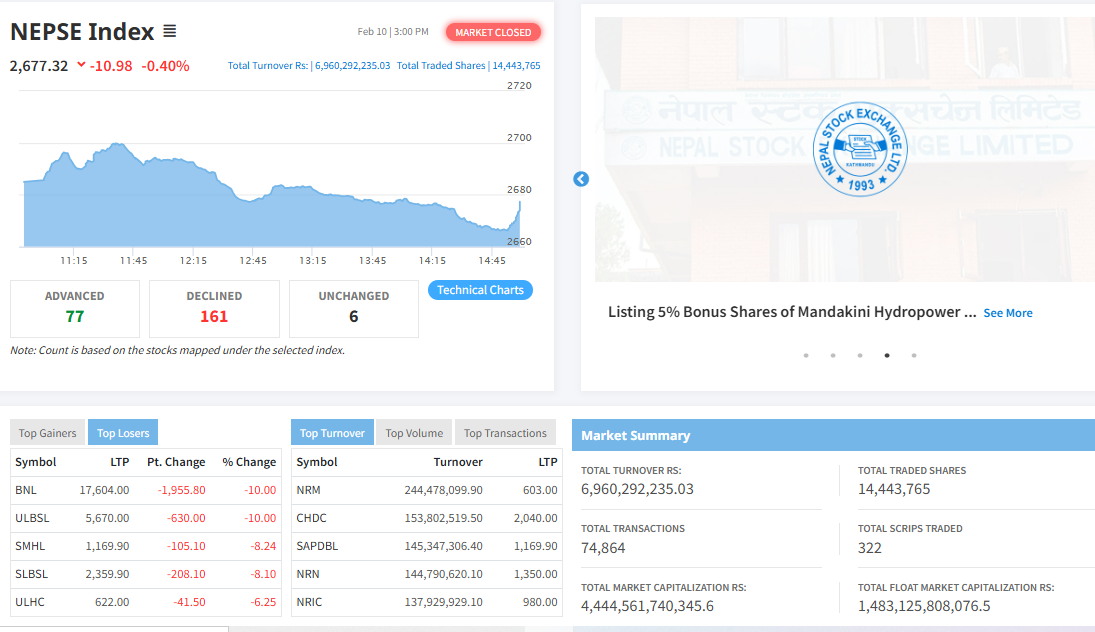 विराटचोकः आज पनि नेप्सेमा गिरावट आएको छ । नेप्से सूचकसँगै कारोबार रकम पनि घटेको छ ।