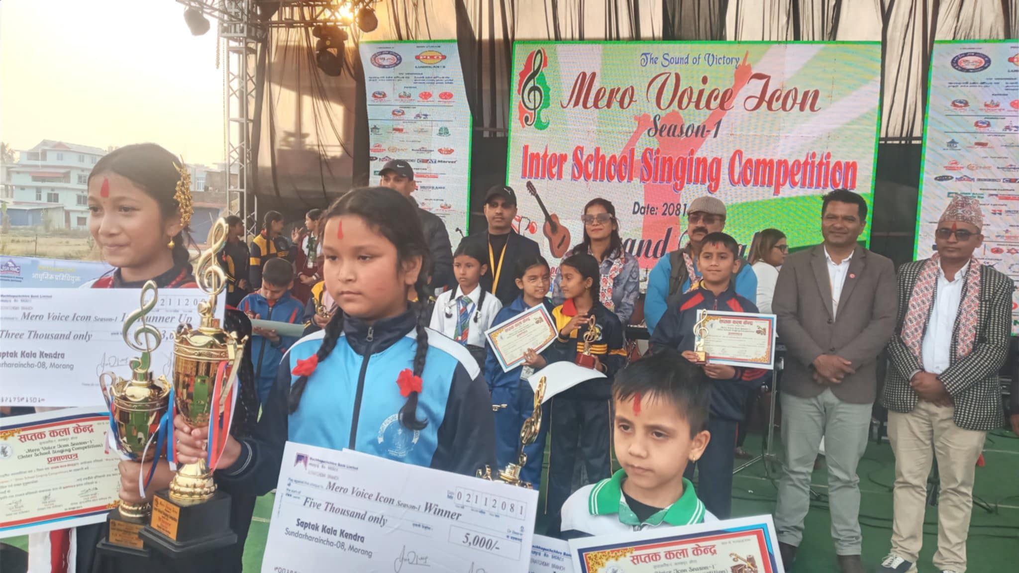 विराटचोकः सुन्दरहरैंचा विराट एक्स्पो ४ अन्तर्गत सप्तक कला केन्द्र सलकपुरको आयोजनामा आज औद्योगिक प्रदर्शनी स्थलमा भएको मेरो भ्वाइस आइकन सिजन १ को विजेता जुनियरतर्फ सोफिया बिष्ट र सिनियरतर्फ तृषा भट्टराई हुनुभएको छ ।