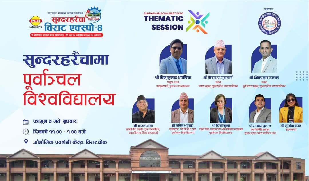 विराटचोकः फागुन १० गतेसम्म सञ्चालन हुने सुन्दरहरैंचा विराट एक्स्पो ४ को दिवाकालीन सत्रमा आज ‘सुन्दरहरैंचामा पूर्वाञ्चल विश्वविद्यालय’ शीर्षकमा बहस हुने भएको छ ।
