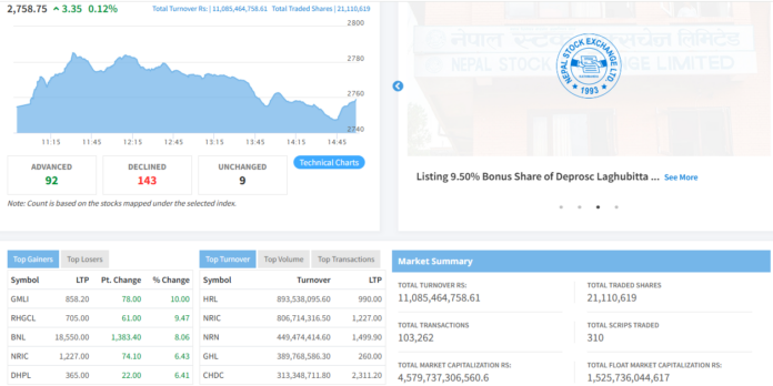 विराटचोकः पछिल्ला ५ कारोबार दिनदेखि लगातार शेयर बजार सूचक नेप्से बढिरहेको छ । यसै क्रममा आज नेप्से परिसूचक ३.३५ अंक बढेर २७५८.७५ बिन्दुमा रोकिएको छ ।