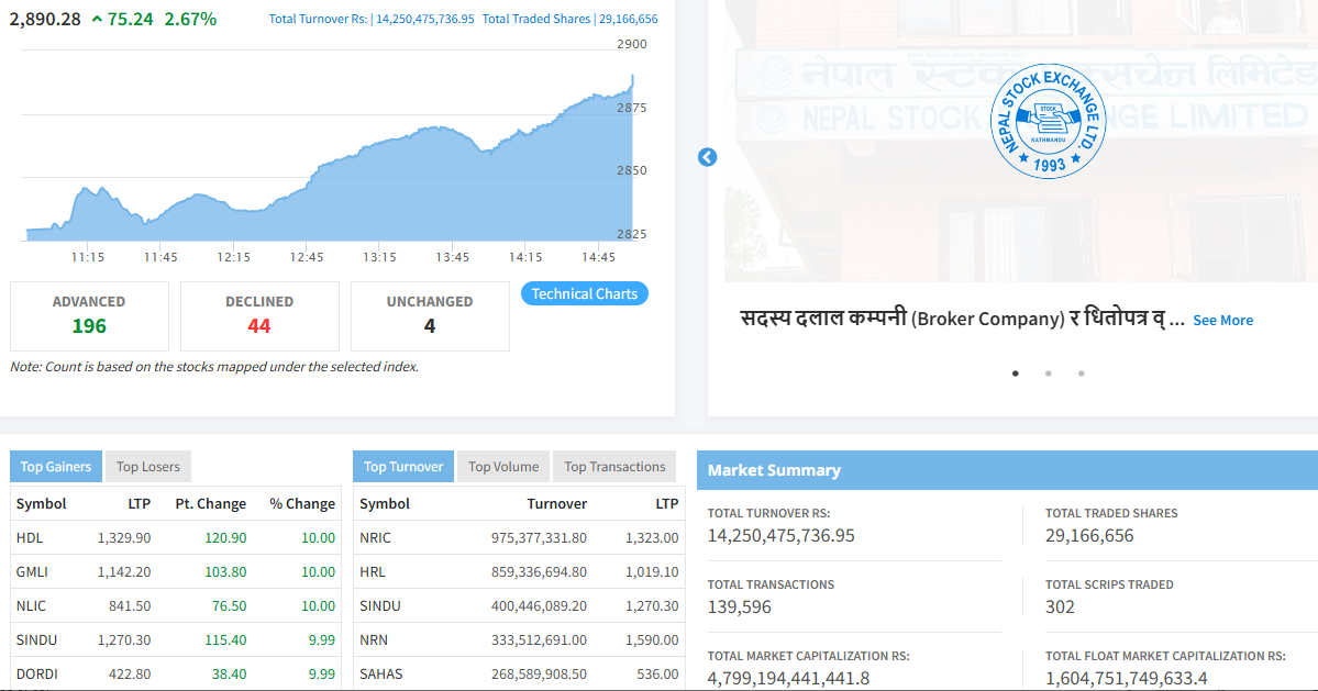 विराटचोकः लगातार ८ दिनदेखि बढिरहेको नेप्से आज ७५ अंकले बढेको छ भने कारोबार रकम ६ महिनायताकै उच्च भएको छ ।