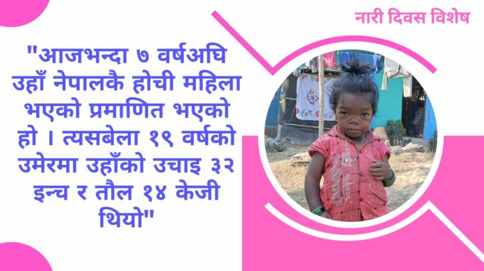आजभन्दा ७ वर्षअघि उहाँ नेपालकै दोस्रो होची महिला भएको प्रमाणित भएको हो । त्यसबेला १९ वर्षको उमेरमा उहाँको उचाइ ३२ इन्च र तौल १४ केजी थियो । तत्कालीन नगरप्रमुख शिवप्रसाद ढकालले पत्रकार सम्मेलन गरी ऋषिदेव नेपालकै होची महिला भएको घोषणा गर्नुभएको थियो । लगत्तै सो रेकर्ड विराटनगरकी एक महिलाले तोड्नुभएको थियो । उहाँको लम्बाइ ३१ इन्च थियो ।