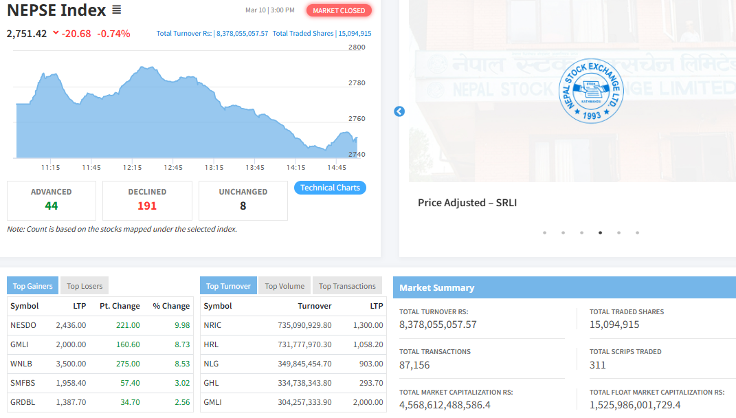 बजार घटेसँगै समग्र बजार पूँजीकरण ४५ खर्ब ६८ अर्ब ६१ करोड २४ लाख ८८ हजार ५८६ रुपैयाँ कायम भएको छ ।