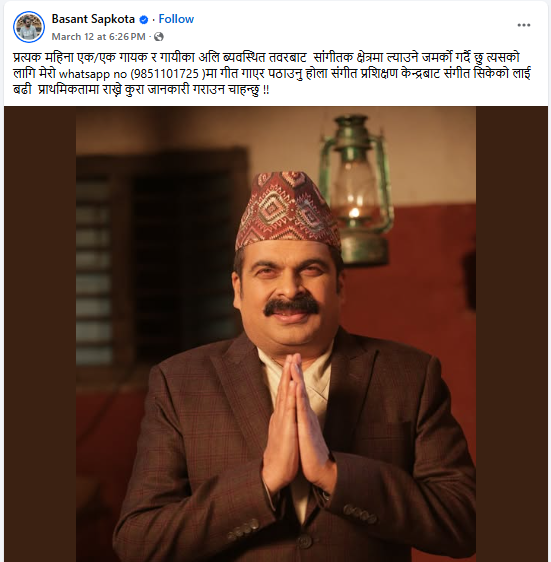 ‘प्रत्येक महिना एक÷एक गायक र गायिकालाई अलि व्यवस्थित तवरबाट सांगीतिक क्षेत्रमा ल्याउने जमर्को गर्दैछु । त्यसको लागि मेरो ह्वाट्स एप नम्बरमा गीत गाएर पठाउनुहोला’, उहाँले फेसबुकमा लेख्नुभएको छ, ‘संगीत प्रशिक्षण केन्द्रबाट संगीत सिकेको लाई बढी प्राथमिकतामा राख्ने कुरा जानकारी गराउन चाहन्छु ।’