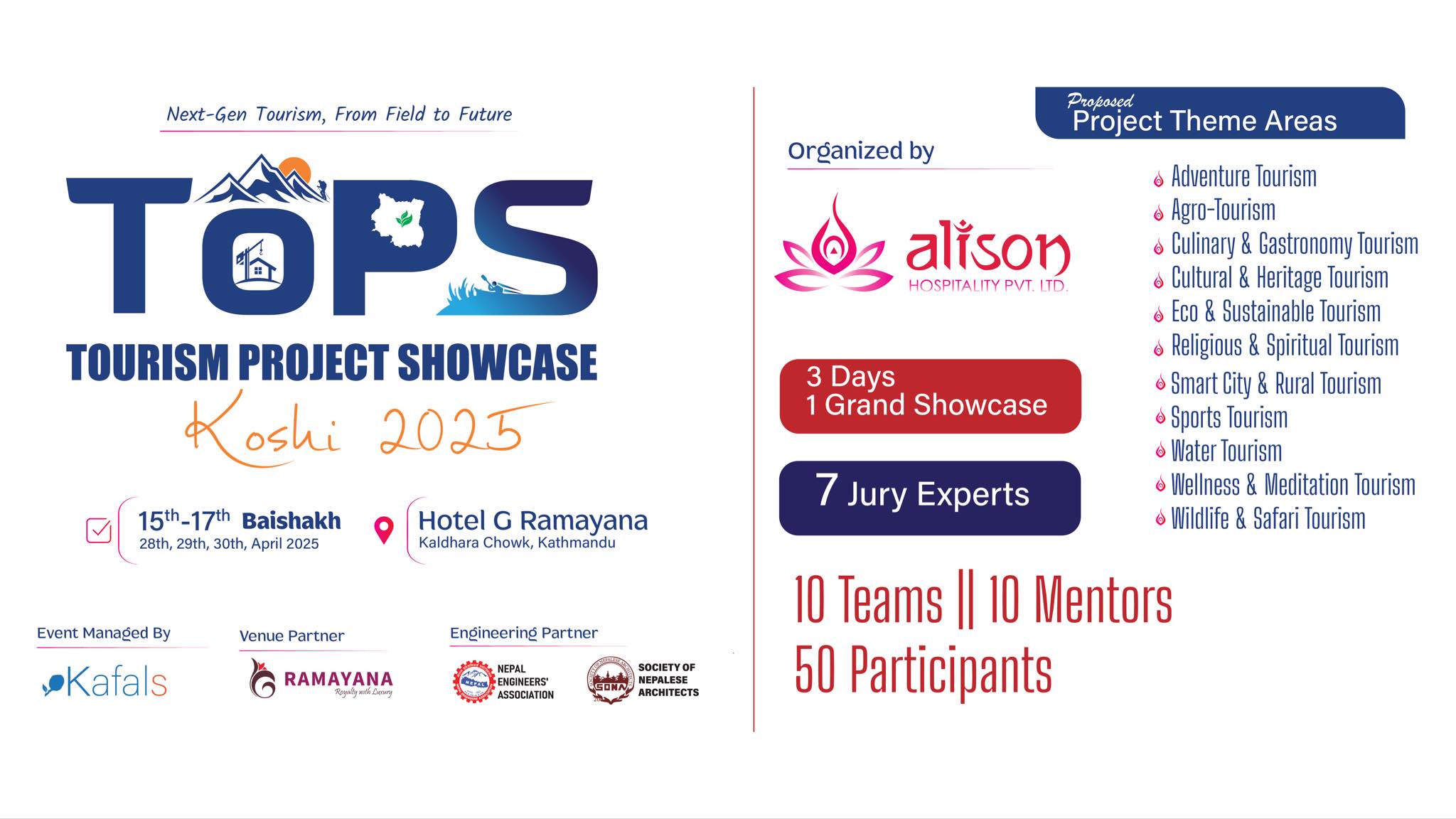 विराटचोकः एलिसन हस्पिटालिटी प्रालिले उद्यमशीलताको क्षेत्रमा नयाँ सोच र नवप्रवर्तकको प्रवर्द्धन गर्ने उद्देश्यले नेपालमै पहिलो पटक इन्जिनियरिङ अध्ययन गरिरहेका विद्यार्थीहरुबीच पर्यटन प्रोजेक्ट सोकेस प्रतियोगिताको आयोजना गर्ने भएको छ ।