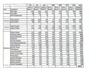 सचिवमा रोहन खत्रीले ९१९ मत ल्याएर विजयी हुँदा नेवि संघका अर्जुन दाहालले ८४१ मत ल्याउनुभयो ।