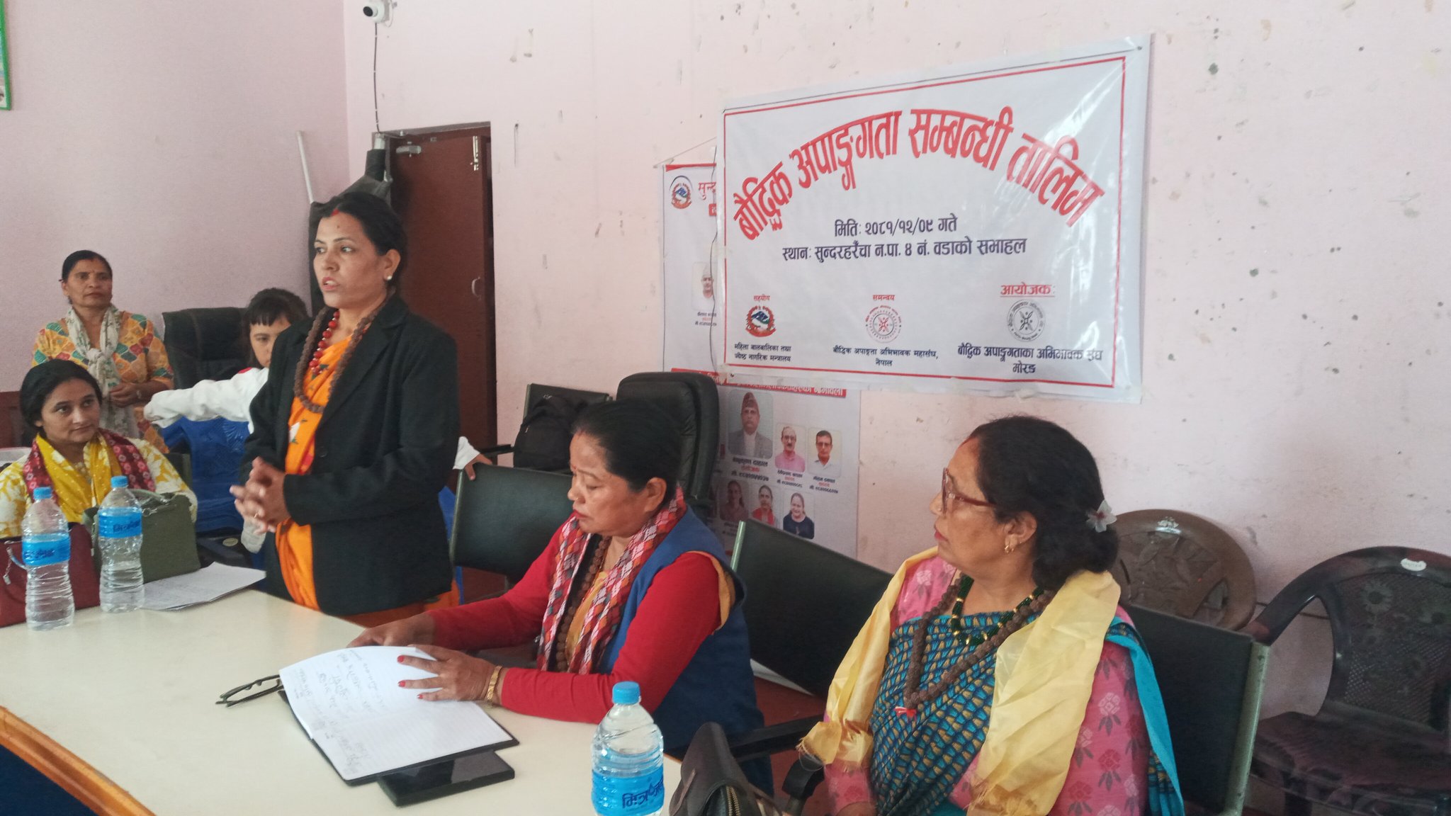 सुन्दरहरैंचा नगरपालिका वडा नम्बर ४ को सभाहलमा आयोजित कार्यक्रमलाई प्रमुख अतिथिको आसनबाट सम्बोधन गर्नुहुँदै सुन्दरहरैंचा नगरपालिकाकी उपप्रमुख अकली चौधरीले अभिभावकमा कानुनी तथा अन्य जानकारी दिन यस्ता कार्यक्रम सहायक हुने बताउनुभयो ।