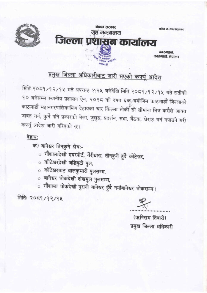 गौशालादेखि एयरपोर्ट, गैरीधारा, तीनकुने हुँदै कोटेश्वर, कोटेश्वरबाट जडिबुटी पुल, कोटेश्वरबाट बालकुमारी पुल, नयाँबानेश्वर चोकदेखि शंखमुल पुलसम्म र गौशाला चोकदेखि पुरानो बानेश्वर हुँदै नयाँ बानेश्वर चोकसम्म कफ्र्यु लगाइएको जिल्ला प्रशासन कार्यालयले जनाएको छ ।