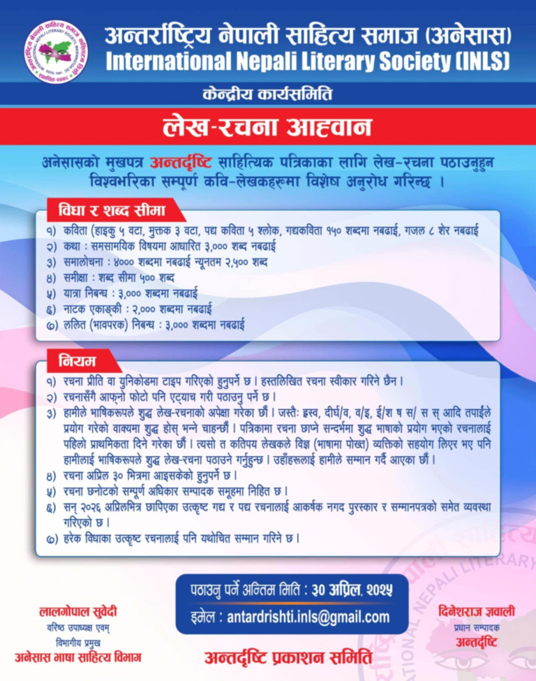 काठमाडौंः अन्तर्राष्ट्रिय नेपाली साहित्य समाज (अनेसास) ले सन् २०२५–२०२६ का लागि अन्तर्दृष्टि साहित्यिक पत्रिकाको सम्पादन मण्डल बिस्तार गरी रचनाहरूको आह्वान गरेको छ ।