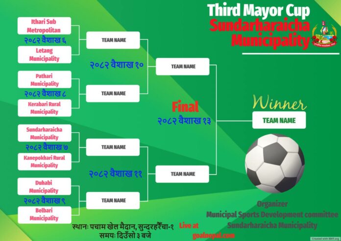 विराटचोकः मोरङको सुन्दरहरैंचा नगरपालिकामा भोलिदेखि तेस्रो सुन्दरहरैंचा मेयर कप फुटबल प्रतियोगिता सञ्चालन हुने भएको छ । आज आयोजित पत्रकार सम्मेलनमा सुन्दरहरैंचा नगर खेलकुद विकास समितिका सदस्य सचिव खड्ग श्रेष्ठले दिनुभएको जानकारी अनुसार प्रतियोगितामा ८ टिम सहभागी हुनेछन् ।