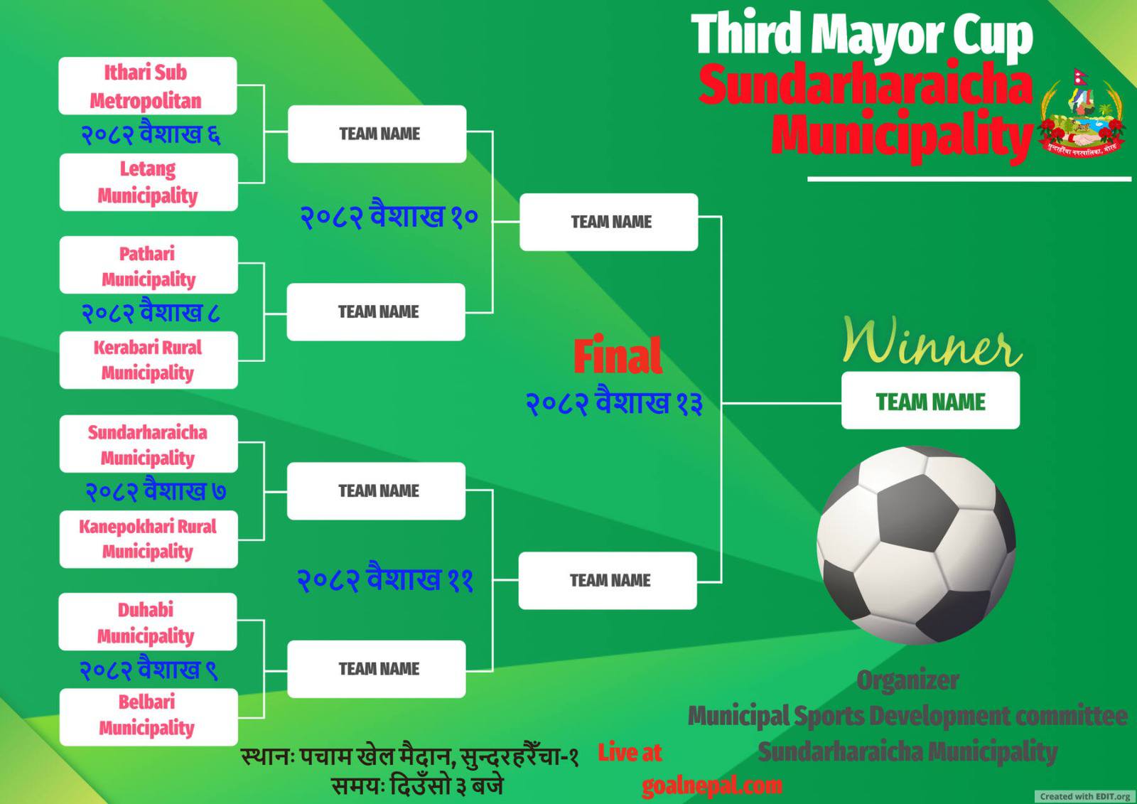 प्रतियोगिताका सबै खेल पचाम खेलमैदान सुन्दरहरैंचा–१ मा हुने भएका छन् । भोलि हुने उद्घाटन खेल इटहरी उपमहानगरपालिका र लेटाङ नगरपालिकाबीच दिउँसो ३ बजे हुनेछ ।
