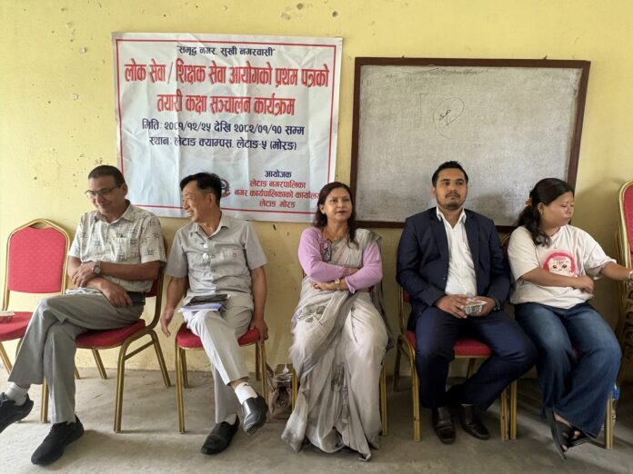लेटाङः लेटाङ नगरपालिकाले लोक सेवा तथा शिक्षा सेवा आयोगको तयारी कक्षा सम्पन्न गरेको छ । गत चैत २५ गतेदेखि शुरु भएको लोक सेवा तथा शिक्षा सेवा आयोगको चौथो पत्रको तयारी कक्षा बुधबार सम्पन्न भएको हो ।