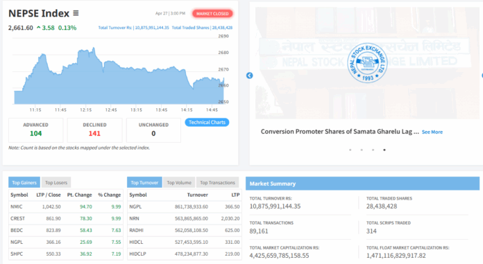 विराटचोकः साताको पहिलो कारोबार दिन आज नेप्से परिसूचक ० दशमव १३ प्रतिशत अर्थात ३ दशमलव ५८ अंकले बढेर २ हजार ६६१.६० विन्दुमा पुगेको छ ।