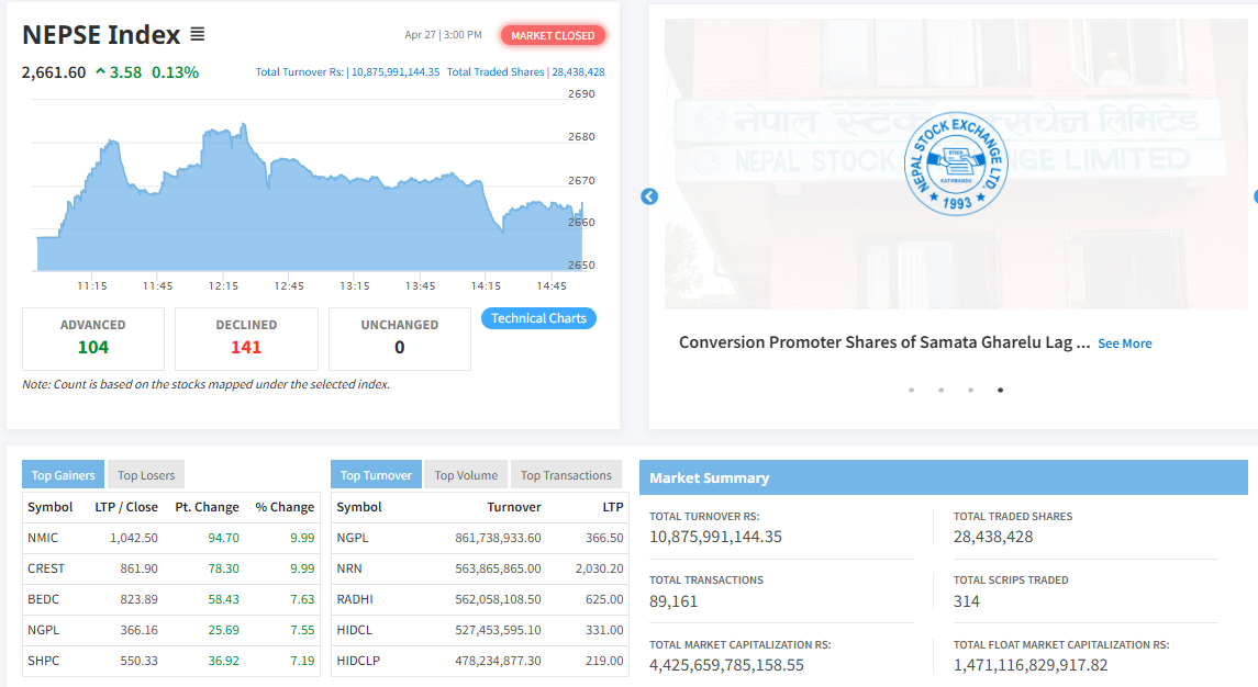 नेप्सेमा सूचीकृत मध्ये ३१४ वटा कम्पनीको २ करोड ८४ लाख ३८ हजार ४२८ कित्ता शेयर ८९ हजार १६१ पटक किनबेच हुँदा १० अर्ब ८७ करोड ५९ लाख ९१ हजा १४४ रुपैयाँको शेयर कारोबार भएको छ । अघिल्लो कारोबार दिन गत बिहिबार ७ अर्ब ८७ करोड रुपैयाँको कारोबार भएको थियो ।
