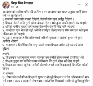 विराटचोकः नेपाल शिक्षक महासंघको आह्वानमा भएको २९ दिन लामो आन्दोलनपछि महासंघ र शिक्षकबीच ९ बुँदे सहमति भएको छ । बुधबार राति भएको सहमतिपछि मोरङका शिक्षक विश्वर सिंह मेवाहाङले सामाजिक सञ्जालमा यसरी प्रतिक्रिया दिनुभएको छ ।