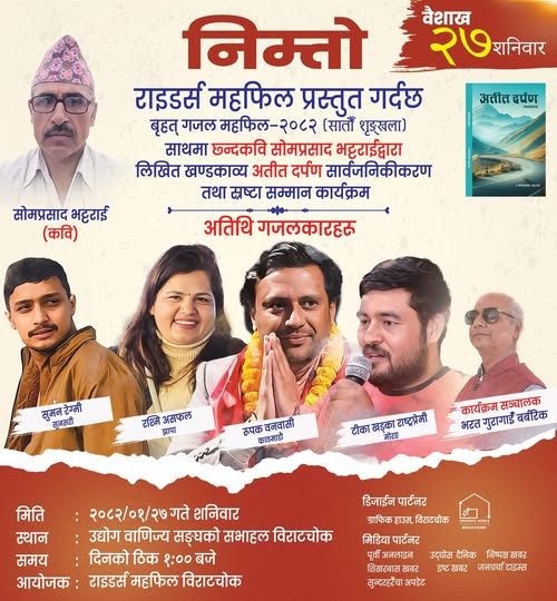विराटचोकः यही बैशाख २७ गते दिउँसो १ बजे राइडर्स महफिल सुन्दरहरैँचाको आयोजनामा गजल महफिलसहित स्रष्टा सम्मान तथा छन्दकवि सोमप्रसाद भट्टराईद्वारा लिखित खण्डकाव्य ‘अतीतदर्पण’ को विमोचन हुने भएको छ ।