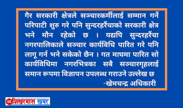 गैर सरकारी क्षेत्रले सञ्चारकर्मीलाई सम्मान गर्ने परिपाटी शुरु गरे पनि सुन्दरहरैंचाको सरकारी क्षेत्र भने मौन रहेको छ । यद्यपि सुन्दरहरैंचा नगरपालिकाले सञ्चार कार्यविधि पारित गरे पनि लागू गर्न भने सकेको छैन । गत माघमा पारित सो कार्यविधिमा नगरभित्रका सबै सञ्चारगृहलाई समान रूपमा विज्ञापन उपलब्ध गराउने उल्लेख छ । हाल नगरपालिकाले केही सञ्चार संस्थालाई मासिक वा द्वैमासिक रुपमा लोककल्याणकारी विज्ञापनको रकम भुक्तानी गर्ने गरेको छ भने केही सञ्चार संस्थालाई वर्षमा एक पटक पनि विज्ञापनको भुक्तानी गरेको छैन ।
