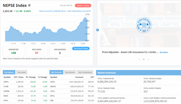 आज नेप्से परिसूचक १७ दशमलव ४४ अंक बढेर २६९३ दशमलव ०६ अंकमा पुगेको छ । आज ८ अर्ब ५८ करोड ६० लाख रुपैयाँको शेयर किनबेच भएको छ ।