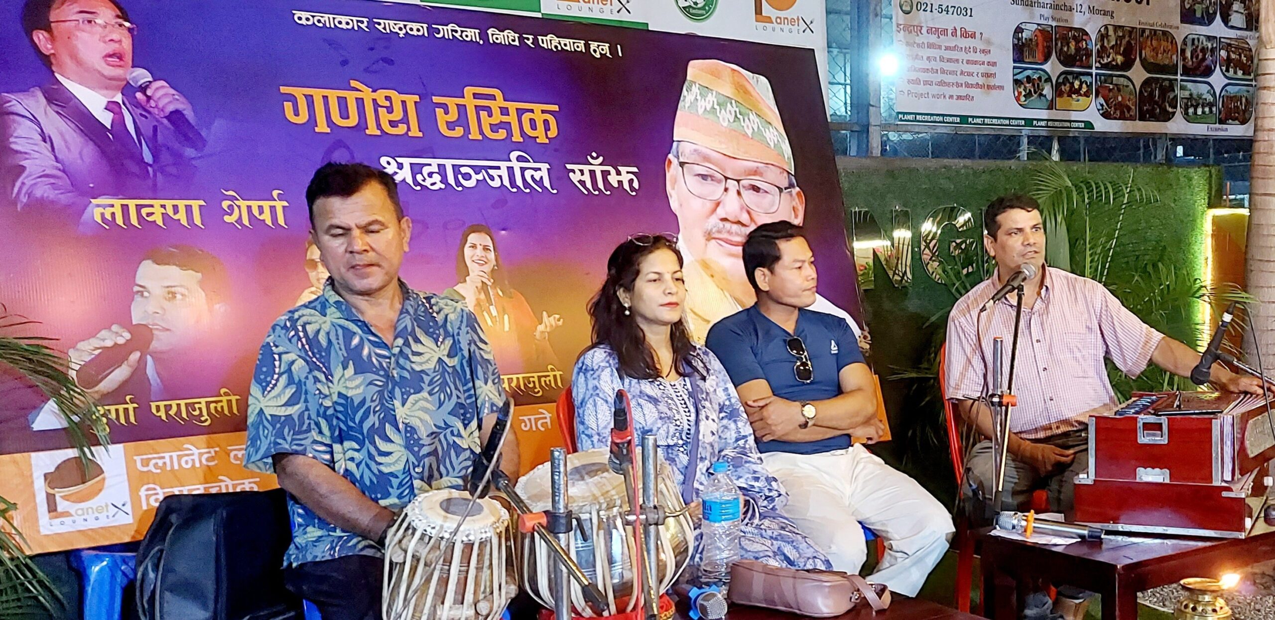 विराटचोकः गायक स्वर्गीय गणेश रसिकको सम्झनामा नझरेका फूलहरुको आयोजनामा शनिबार विराटचोकस्थित प्लानेट लाउञ्जमा श्रद्धाञ्जली साँझ सम्पन्न भएको छ ।