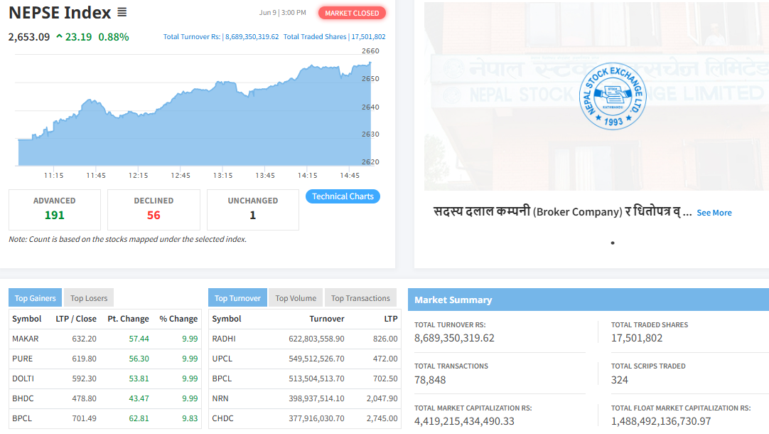 विराटचोकः लगातार चार दिन घटेको नेप्से परिसूचक हिजो ०.८८ प्रतिशत अर्थात २३.१९ अंकले बढेर २ हजार ६५३.०९ विन्दुमा पुगेको छ । नेप्सेमा सूचीकृतमध्ये हिजो ३२४ वटा कम्पनीको १ करोड ७५ लाख १ हजार ८०२ कित्ता शेयर किनबेच हुँदा ८ अर्ब ६८ करोड ९३ लाख ५० हजार ३१९ रुपैयाँको कारोबार भएको छ ।