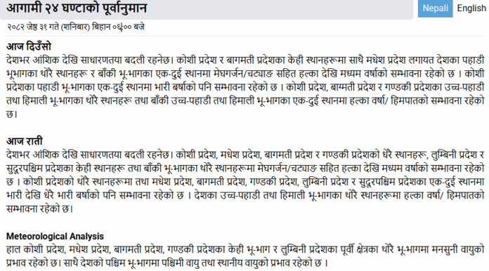 आज दिउँसो देशभर आंशिकदेखि साधारणतया बदली रहने महाशाखाले जनाएको छ । कोशी र मधेस प्रदेशलगायत देशका पहाडी भूभागका थोरै स्थानहरू र बाँकी भू–भागका एक–दुई स्थानमा मेघगर्जन र चट्याङसहित हल्कादेखि मध्यम वर्षाको सम्भावना रहेको छ । कोशी प्रदेशका पहाडी भू–भागका एक–दुई स्थानमा भारी वर्षाको पनि सम्भावना रहेको महाशाखाले जनाएको छ ।