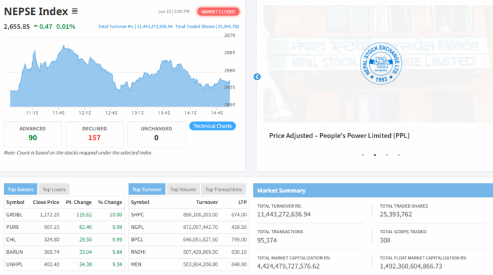 विराटचोकः असारको पहिलो कारोबार दिन आज नेपाल स्टक एक्सचेञ्च (नेप्से) झिनो अंक ० दशमलव ०१ प्रतिशत अर्थात् ० दशमलव ४७ अंकले बढेर २ हजार ६५५ दशमलव ८५ बिन्दुमा रोकिएको छ ।