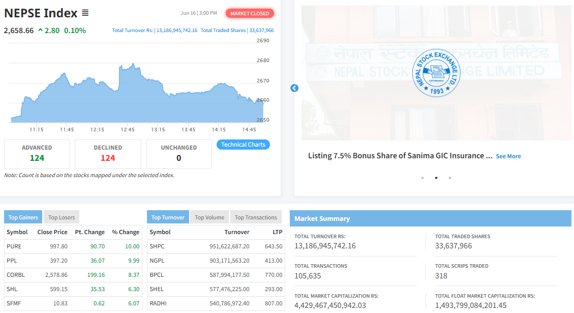 आज नेप्से २ दशमलव ८० अङ्क अर्थात् ० दशमलव १० प्रतिशत बढेर २६५८ दशमलव ६६ विन्दुमा रोकिएको छ ।