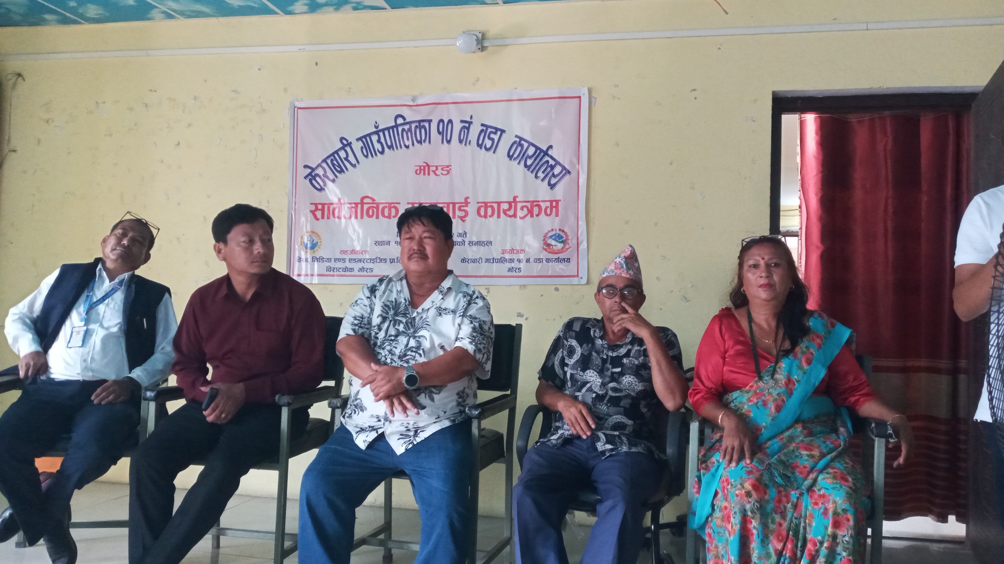 केराबारी गाउँपालिका वडा नम्बर १० का वडाध्यक्ष पूर्णबहादुर मगरको अध्यक्षतामा तथा विराट मिडिया एण्ड एड्भरटाइजिङ प्रालिको सहजीकरणमा सार्वजनिक सुनुवाइ भएको थियो । कार्यक्रममा वडा सदस्य तुलसी घिमिरे, मिथुन धुवकुमार देवान, गंंगा लिम्बू, मीराकुमारी विश्वकर्मा, वडा सचिव देशबहादुर तामाङ, मोक्तान, केराबारी अस्पताल प्रमुख रमेशबहादुर भट्टराई, इलाका प्रहरी कार्यालय केराबारीका प्रतिनिधि फणिन्द्रकुमार तोलाङ्गीलगायतको उपस्थिति थियो ।