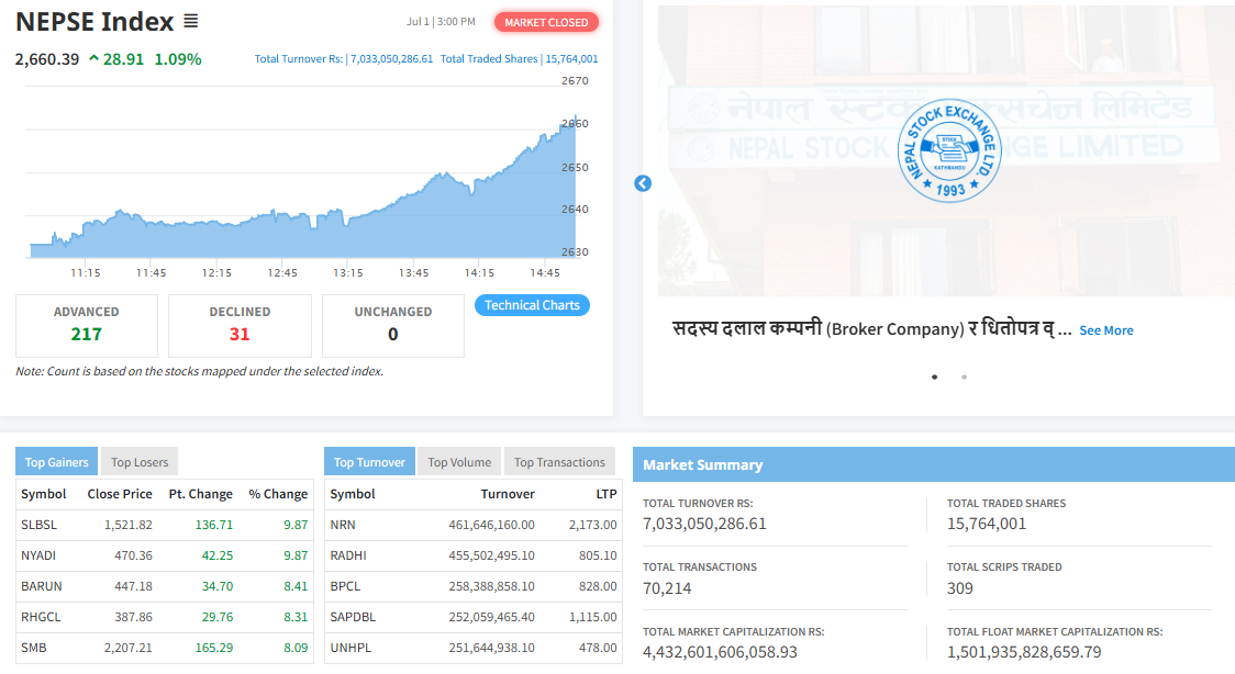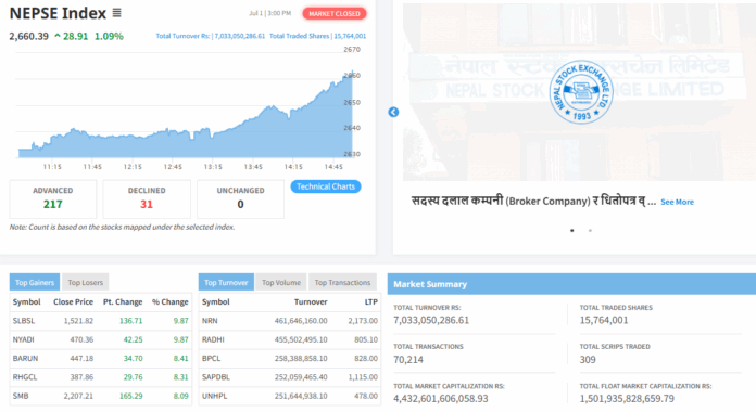 नेप्सेसँगै आज कारोबार रकम पनि बढेर ७ अर्ब ३ करोड ३० लाख ५० हजार २८६ रुपैयाँको कारोबार भएको छ । ३०९ कम्पनीको १ करोड ५७ लाख ६४ हजार १ कित्ता शेयर ७० हजार २१४ पटक किनबेच भएको हो ।