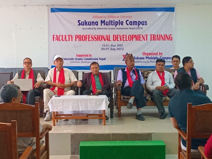 विराटचोकः बुधबारदेखि सुकुना बहुमुखी क्याम्पस सुन्दरहरैंचा, मोरङमा फ्याकल्टी प्रोफेसनल डेभलपमेन्ट ट्रेनिङ कार्यक्रम शुरु भएको छ । विश्वविद्यालय अनुदान आयोगको आर्थिक सहयोग तथा क्याम्पसको आयोजनामा शुरु भएको तलिम ६ दिन सञ्चालन हुनेछ ।